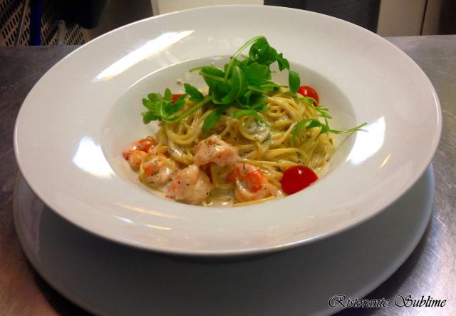 Esparguete com Molho de Salsa, Nero e Gorgonzola com Camarão